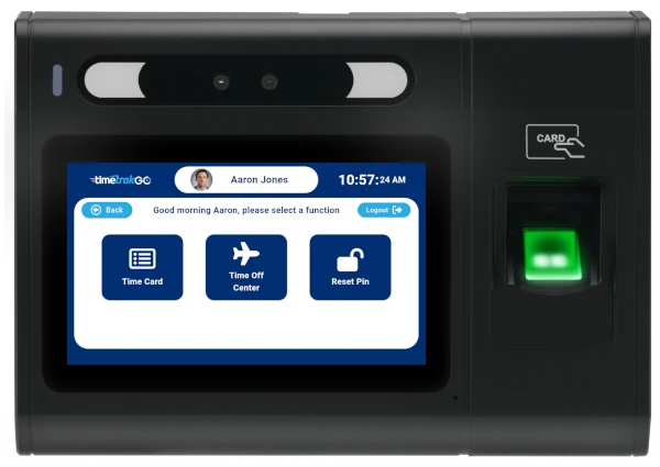 TimeTrak’s advanced employee time clock integrates directly with QuickBooks Desktop, offering RFID badge scanning, fingerprint recognition, or facial recognition options.