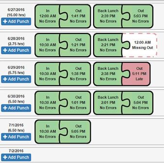infoPLUS features unique graphical employee time cards that provide a visual snapshot of work hours, making it easy for employees to identify missing punches or exceptions like absenteeism or tardiness. This real-time visibility ensures accuracy and puts control in the hands of your employees.